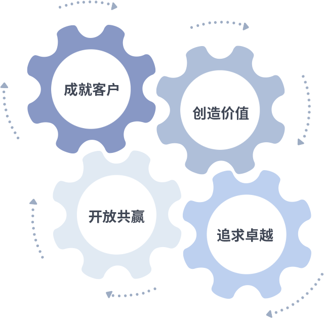 成就客户是一切决策的出发点,,,,创造价值是衡量所有工作的标准,,,,追求卓越是我们做事做人的态度,,,开放共赢是我们的格局也是最终的结果。。。。价值观的齿轮环环相扣,,,推动着组织里的每个人不断向前。。